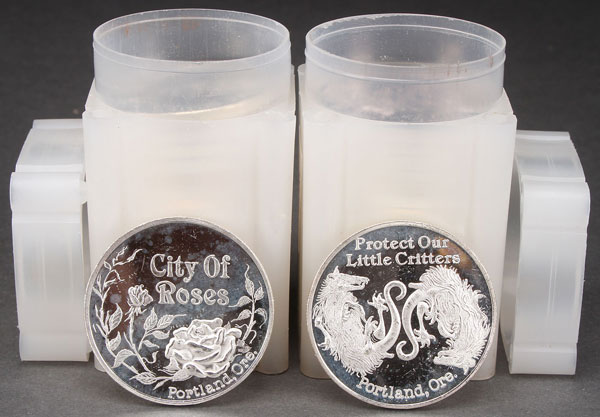 TWO ROLLS OF ONE OUNCE SILVER ROUNDS. Proof style trade units with designs for Portland Oregon, 40 Troy oz. total.