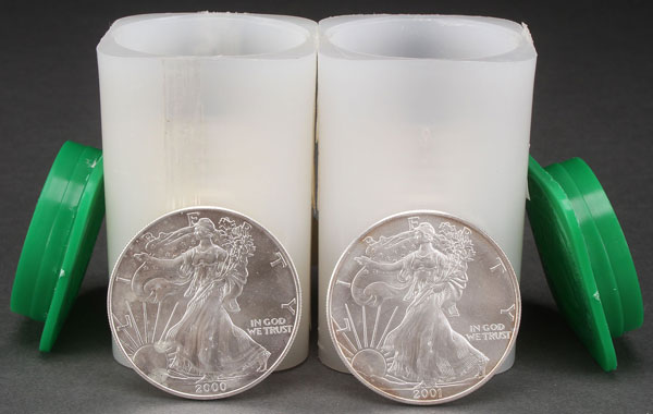 TWO ROLLS OF AMERICAN SILVER EAGLE $1 COINS. All uncirculated, comprising 20-2000 and 20-2001 coins. In U.S. Mint containers. 1 Troy oz. each.