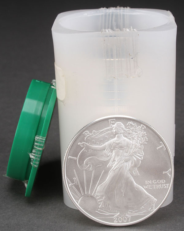 A ROLL OF 20-2007 AMERICAN SILVER EAGLES. Uncirculated, in original U.S. Mint container, 1 Troy oz. each.