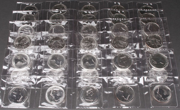 50-1989 CANADIAN SILVER MAPLE LEAFS. Contained in original bubble packs. 50 Troy oz. total.