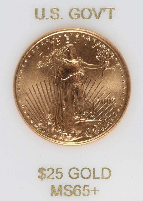 A 2003 AMERICAN GOLD EAGLE. $25 gold coin contained in a plastic case labeled MS65+, .5 Troy oz.