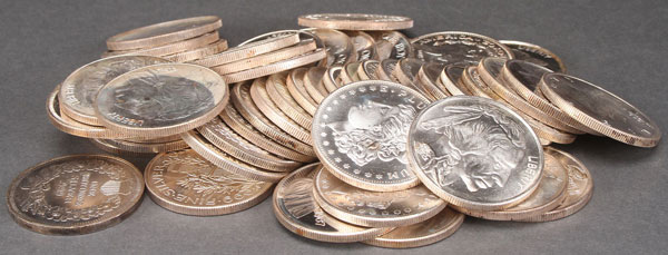 A GROUP OF 50 ONE OUNCE SILVER ROUNDS. With mixed designs after U.S. coins including Buffalo nickel, Morgan dollar, and Mercury dime. 50 Troy oz. total.
