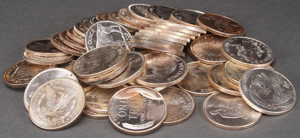 A GROUP OF 50 ONE OUNCE SILVER ROUNDS. With mixed designs after U.S. coins including Buffalo nickel, Morgan dollar, and Mercury dime. 50 Troy oz. total.