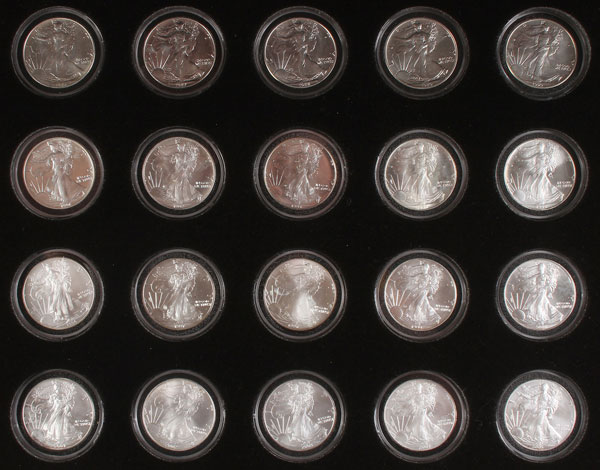 A 20TH ANNIVERSARY COLLECTION OF AMERICAN SILVER EAGLE $1 COINS. Comprising 20 uncirculated coins in consecutive years from 1986-2005, contained in an attractive solid cherry wood case.