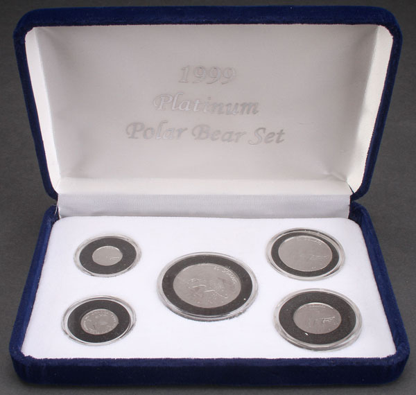 A 1999 CANADIAN PLATINUM POLAR BEAR PROOF COIN SET. Comprising $50, $20, $10, $5, and $1 coins. 2.05 Troy oz. total platinum. Contained in the original fitted case and placard stating the set is limited to 229 complete 5 coin sets.