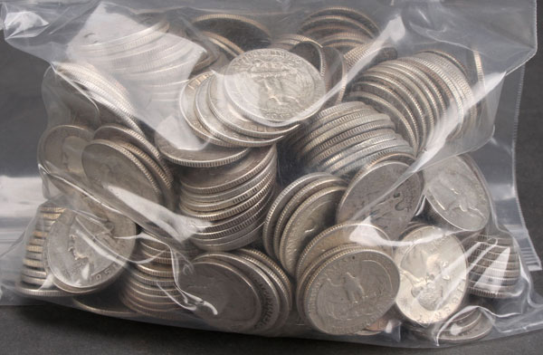 345 U.S SILVER QUARTERS. Mostly Washington quarters dated 1964 and earlier, with some Walking Libertys. Mixed dates and condition.