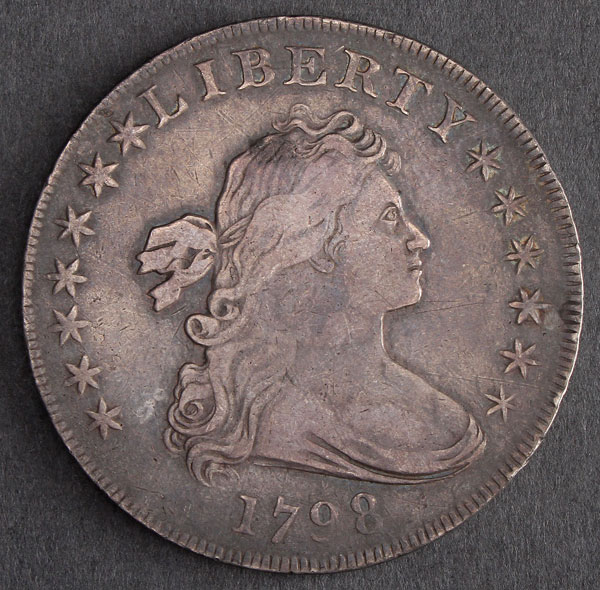 A U.S. 1798 DRAPED BUST DOLLAR. F to VF with nice tone.