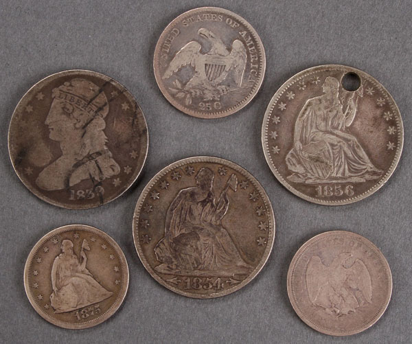 A GROUP OF EARLY U.S. COINS. Comprising 1839, 1854 and 1856 half dollars, and 1833 and 1875 quarters. Various circulated condition.