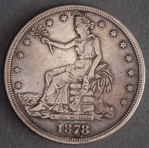 A U.S. 1878-S SILVER TRADE DOLLAR.