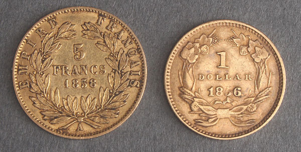A U.S. 1856 LIBERTY HEAD GOLD DOLLAR. Together with a French 1858 five Franc gold piece.
