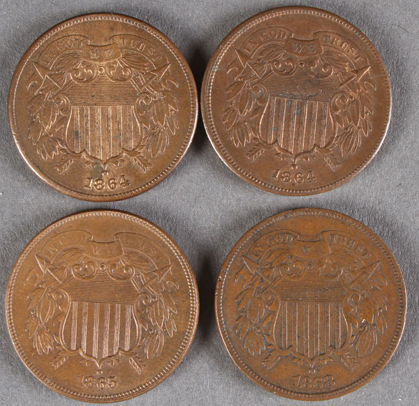 14 EARLY U.S. COPPER CENTS. Comprising two 1864 2 cent pieces (large motto) VF to EF, two 1865 2 cent pieces one VG and one AU, an 1866 2 cent piece VG to F, an 1868 2 cent F to VF, an 1870 2 cent VG, an 1851 half cent, an 1810 half cent AG, and four large cents circa 1800 (mostly PO).