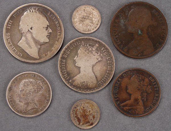 SEVEN GEORGIAN PERIOD COINS. Including copper and silver.