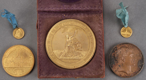A GROUP OF GILT BRONZE COMMEMORATIVE COINS AND METALS. Comprising a large 1876 U.S. Centennial medal, Julian-CM-11 in gilt copper contained in original fitted case; an 1893 World's Columbian Exposition Treasury medal, a miniature George Washington medal and birth place of Liberty medal with Lord's Prayer on verso. Together with a Coronation of Napoleon French medal dated 1805.