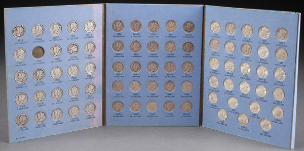 A MERCURY HEAD DIME COLLECTION, COMPLETE SANS 1918. 74 coins including an AG-G 1916-d, the others in mixed condition with early dates ranging mostly G-F and later dates mostly VF to AU.