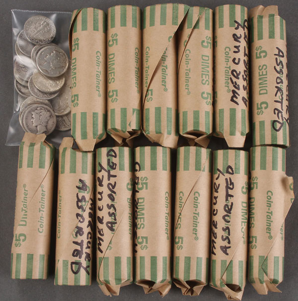 13 ROLLS OF SILVER MERCURY DIMES. Average circulated condition, mixed unsorted dates. Together with 21 loose mercury dimes; 671 coins total.