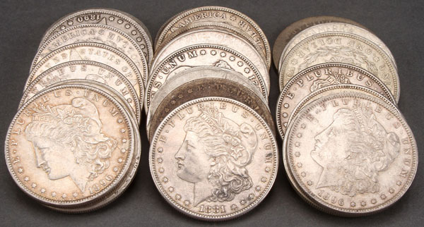 23 MORGAN AND PEACE SILVER DOLLARS. Mixed dates and circulated grades, comprising 17 Morgan's and 6 peace.