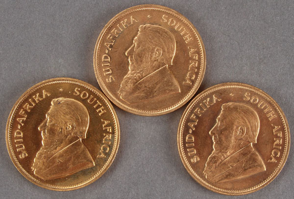 THREE SOUTH AFRICA GOLD KRUGERRANDS. 1978, each 1 Troy ounce.