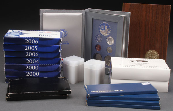 U.S. PROOF AND UNCIRCULATED SETS. Comprising a 1986 prestige set, 1971 Eisenhower proof dollar, 14-1981 Mint sets, a 1975 and 1976 proof set, three 2000 proof sets, three 2004 proof sets, a 2005 proof set, two 2006 proof sets, two 2007 proof sets, a 2009 proof set, two 1966 Mint sets, two 1967 Mint sets, 22-1976 Kennedy uncirculated halves, and 26-1973 uncirculated Kennedy halves.