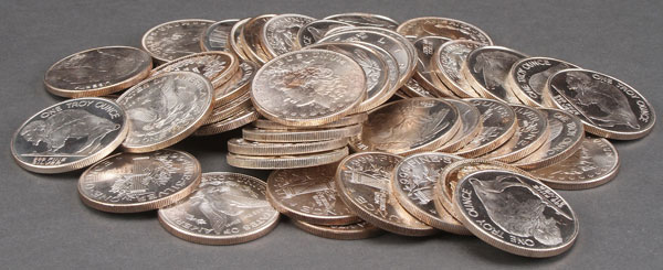 50 1 OZ. SILVER ROUNDS. Mixed designs after U.S. coins, including Buffalo nickel, Mercury dime, and seated, Morgan and Peace dollars.