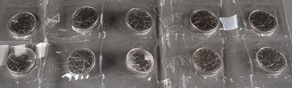 TEN CANADIAN PALLADIUM $50 COINS. Each 2005 1 Troy oz. palladium coin in original bubble pack.