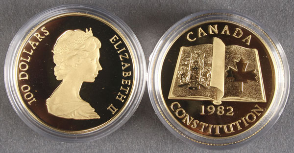 TWO 1982 CONSTITUTION $100 CANADIAN GOLD MAPLE LEAF PROOFS. Each in leather cases.