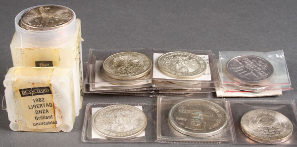 A MEXICAN SILVER ROUND AND PESO GROUP. Comprising a roll of 20 1982 silver Libertads, 1 oz. BU; two 1985 silver Libertads; two 1979 silver rounds, nine 1977 100 pesos (72% silver), a 1968 Olympic 25 peso, and Junior Johnson Grand National silver Olympic medallion.