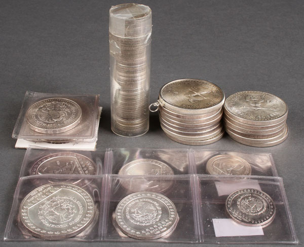 A MEXICAN SILVER ROUND AND PESO GROUP. Comprising 14 1979 and 1980 rounds, three 1948 5 pesos (90%), a 1985 1 oz. round and two 3-coin 1992 commemorative sets each with a silver $100, $50, and $25. Together with 57 mixed date 20 centavos.