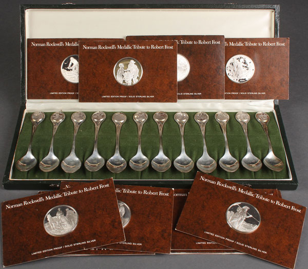 A FRANKLIN MINT STERLING GROUP. Comprising 11 "Norman Rockwell Tribute to Robert Frost" silver proof medals, a set of 12 sterling "Days of Christmas" spoons (12 troy ounces), and a 1975 membership card with silver medal.