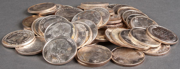 50 1 OZ. SILVER ROUNDS. Mixed designs after U.S. coins, including Buffalo nickel and Morgan dollar.