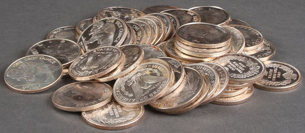 50 1 OZ. SILVER ROUNDS. Mixed designs after U.S. coins, including Buffalo nickel and Morgan dollar.