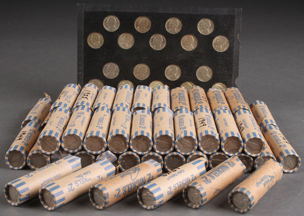 52 ROLLS OF JEFFERSON NICKELS. Assorted circulated grades, with some mint state. Comprising one roll 1933, ten rolls 1939, two rolls 1943-p, three rolls 1946-s, 15 rolls 1949, four rolls 1952, six rolls 1953, ten rolls 1955, and one roll 1960. Together with an uncirculated set of 1938-1943, comprising 18 coins.
