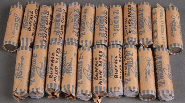 20 ROLLS OF BUFFALO NICKELS. Mixed dates. Together with a nearly complete roll and 10 loose nickels, majority if not all with readable dates, in various circulated condition grades.
