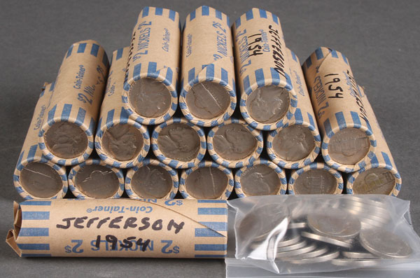 17 ROLLS 1954 JEFFERSON NICKELS. Mostly AU to BU. Together with 29 loose 1954 nickels.