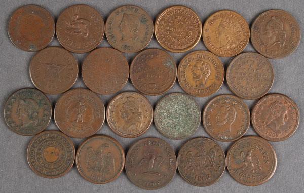 A COLLECTION OF 23 CIVIL WAR ERA COPPER TRADE TOKENS. Including 1864 A.Lincoln president, 1863 Horrors of War, Bergan Ironworks Store, 1863 Maloney, 1863 Pro Bono Publico, 1863 Meyer Milwaukee, 1861 Child's Maner, Knickerbocker currency, 1865 Samuel Geitey Stoves, 1863 "Shoot Him on the Spot", and others.
