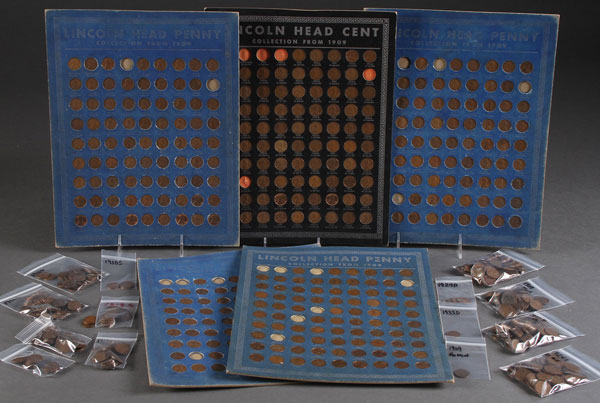 FIVE NEARLY COMPLETE LINCOLN HEAD PENNY SETS. 1909 through 1938 (no 09-s-vdb, 09-s, 14-d, 31-s). Various assorted condition. Together with bags of loose coins of the following dates and quantities, 1886 Indian (one), 1909 (53), 1910-s (27), 1911-d (38), 1911-s (one), 1912-d (62), 1912-s (10), 1913-s (13), 1915-d (113), 1915-s (12), 1921-s (96), 1922-d (51), 1924-d (four), 1924-s (66), and 1931-d (eight).