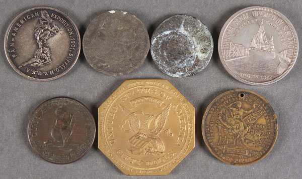 SEVEN 19TH CENTURY SILVER AND BRONZE TOKENS AND MEDALS. Comprising a silver Panama California Exposition 1915 (HK-426), a silver Pan-American Exposition 1901, a gilt bronze Pan-American 1901, a 1938 "Am I Not a Woman & a Sister" (anti-slavery), an 1850 California $50 gold slug facsimile, and a 1722 Rosa Americana penny facsimile.