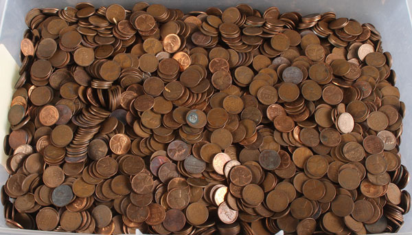 A HOARD OF U.S. LINCOLN WHEAT PENNIES. An unsorted group, with a variety of dates through the entire range of minting. In various condition including BU (later dates). Approximately 4,290 coins (count determined by weight, 472.4 net ounces).