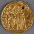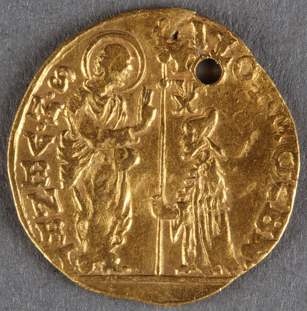 A VENICE (1700-09) GOLD ZECCHINO DUCAT. Depicting Christ facing Doge and with St. Mark on verso, VF with drilled hole.