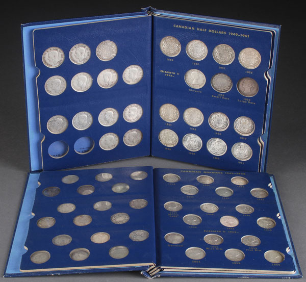 A CANADIAN SILVER HALVES AND QUARTERS COLLECTION. Contained in two folders, comprising a nearly complete set of halves, 27 coins starting at 1937 with 1947 “Maple Leaf”, 1948, and 1953 absent, folder also includes two 1874, a 1909, 1910 and 1918 half. Together with a complete set of Canadian quarters 1921 to 1964 (46 coins) with an extra 1952 & 1957, a 1910, 1913, 1918, and an unreadable 190?.