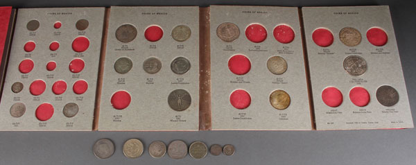 A PARTIAL MEXICAN SILVER TYPE COIN SET. 25 coins total comprising 1905 five centavos, 1936 five centavos, 1893 and 1891 ten centavos, 1866 and 1884 50 centavos, 1936 and 1939 ten centavos, 1951 25 centavos, 1826 two reales, 1935 and 1950 50 centavos, 1866 50 centavos, 1910 and 1935 one peso, two 1947 and one 1950 one peso, 1957 one peso, 1921 two peso, 1948 five peso, 1955 and 1959 five peso, 1957 ten peso, 1949 una onza (1 oz. silver), and an 1896 Libertad. All in various condition.
