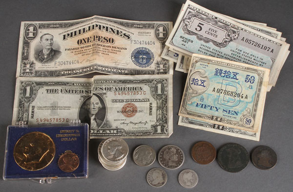 A MIXED U.S. COIN AND CURRENCY GROUP. Comprising an 1834 capped bust dime, 1909 Morgan dime, 1803 half penny (AG), 1864 two cent (narrow D, AG-G), 1906 Morgan quarter (de-faced), 10 silver Washington quarters, roll of 1975-d uncirculated Lincoln cents, gold plated 1974 Ike dollar, 1935-a $1 silver cent with Hawaii overstamp, a series No. 66 Philippines 1 peso note, assorted U.S. military paper script, loose mixed Lincoln cents, a 1794 "Rule Britannia" half penny token, and other items, show partially illustrated.