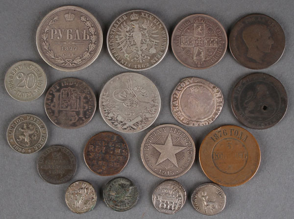 A LARGE MIXED FOREIGN AND ANCIENT COIN GROUP. Over 250 pieces including, a Russian Rouble and 1876 5 Kolpek, 1794 German states Heller, 1862 Prussian silver Vereinsthaler, several Cuban silver Libertads, Egyptian silver coins, two Roman Denarius, an Irish 1604 James I hammered silver six pence, a 1950 nine coin box proof set, and more. Shown partially illustrated.