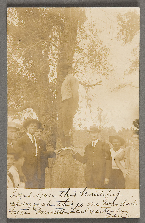 A BLACK LYNCHING REAL PHOTO POSTCARD early 20th century. Depicting a black hanging corpse and onlookers with WOF I send you this beautiful photograph, this is one who died by the unwritten law yesterday. Postally unused. Very good to excellent condition.