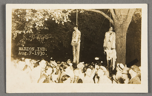 A BLACK LYNCHING REAL PHOTO POSTCARD circa 1930. Depicting the lynching of Thomas Shipp and Abram Smith, who were charged with robbing and murdering white factory workers and raping his girlfriend. A slightly different image of the previous lot. Postally unused. Excellent condition.