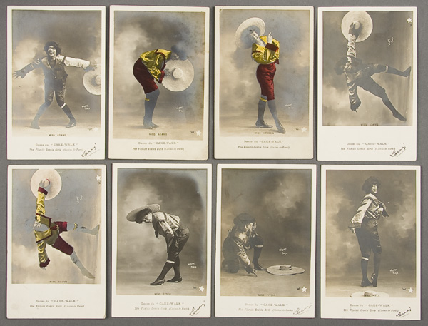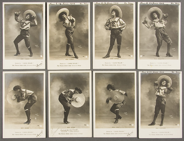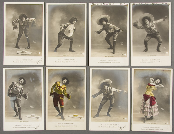 32 FRENCH CAKE WALK REAL PHOTO POSTCARDS early 20th century. The Florida Creols Girls by Walery, Paris. Featuring various black entertainers including Miss Hall, Miss Hobson, Miss Adams and Miss Shippert. Some duplicate images and several hand colored. Majority postally used. Very good to excellent condition.