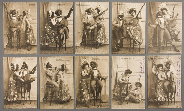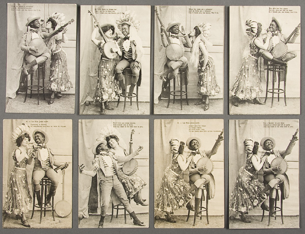A 10-CARD FRENCH CAKE WALK POSTCARD SET early 20th century. Printed images depicting a young black man and white woman with banjo. Together with eight duplicate images. Some WOF. Several postally used. Very good to excellent condition.