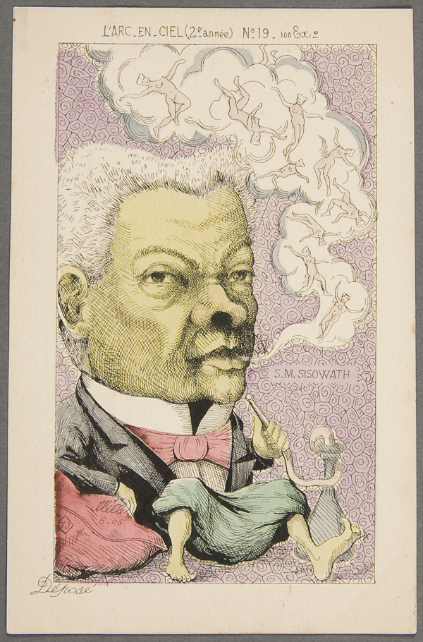 A S.M. SISOWATH POLITICAL SATIRE POSTCARD early 20th century. Depicting the King of Cambodia smoking a water pipe and entitled The Rainbow referring to a whispy cloud of dancing nudes. Printed in France. Postally unused. Excellent to near mint condition.