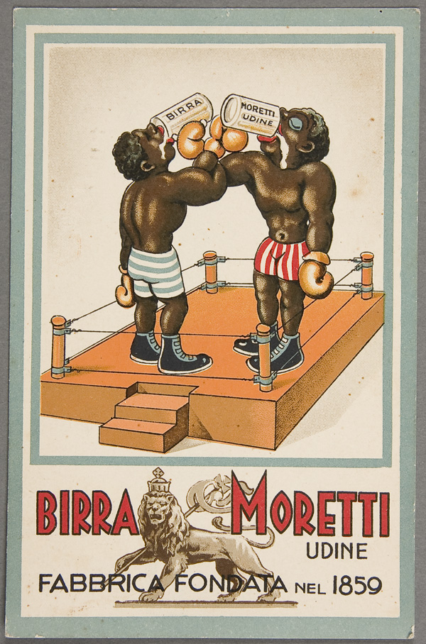AN ITALIAN BIRRA MORETTI ART DECO ADVERTISING POSTCARD postmarked 1921. For the Italian brewing company depicting two black boxers drinking beer. Excellent condition with some foxing.