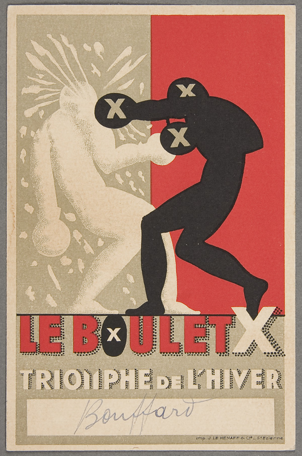 A FRENCH LE BOULET X ART DECO ADVERTISING POSTCARD early 20th century. Triomphe de L'Hiver (Triumph Over Winter) depicting black and white boxers. Postally unused. Near mint to mint condition with WOB.