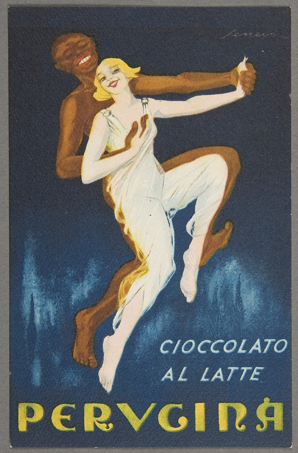 AN ITALIAN PERVGINA MILK CHOCOLATE ART DECO ADVERTISING POSTCARD early 20th century. Depicting a black man and white woman dancing. Postally unused. Near mint to mint condition.